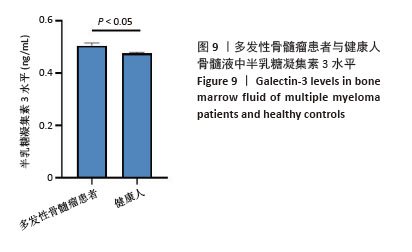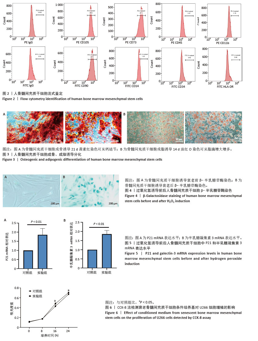 METHODS: Bone marrow blood was collected from healthy donors, and bone marrow mesenchymal stem cells were extracted by Ficoll density gradient centrifugation and adherent purification. The third-generation bone marrow mesenchymal stem cells were taken and induced with 200 µmol/L hydrogen peroxide solution for 2 hours. After the treatment was completed, they were replaced with L-DMEM complete medium for 24 hours of culture to construct the senescent bone marrow mesenchymal stem cell model. β-Galactosylase staining and senescence gene P21 were used for identification. Meanwhile, the expression of galectin-3 in aging bone marrow mesenchymal stem cells was detected by RT-qPCR. The supernatant of senescent bone marrow mesenchymal stem cells was collected and the conditioned medium of senescent bone marrow mesenchymal stem cells was prepared by centrifugal concentration. After culturing the multiple myeloma cell line U266 for 24 hours with it, the proliferation of U266 cells was detected by CCK-8 assay. The apoptosis of U266 cells was detected by flow cytometry. The expression levels of BCL-2 protein and mRNA in U266 cells were detected by RT-qPCR and western blot assay. Bone marrow blood was collected from patients with multiple myeloma and healthy individuals. The level of galectin-3 was detected by ELISA.