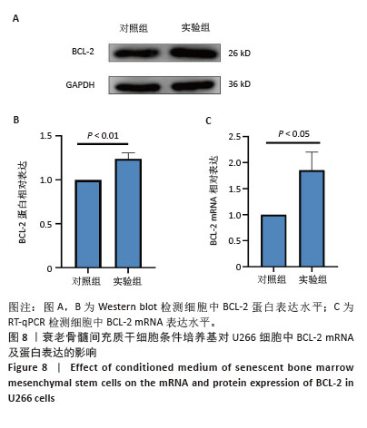 RESULTS AND CONCLUSION: (1) After hydrogen peroxide induction, the number of cells positive for β-galactosidase staining increased significantly, and P21 and galectin-3 mRNA expression levels were upregulated (P < 0.01). (2) Compared with the control group, 24 hours of culture of U266 cells with conditioned medium from senescent bone marrow mesenchymal stem cells increased the level of cell proliferation (P < 0.05), decreased the apoptosis rate (P < 0.05), and rose the expression levels of BCL-2 protein and mRNA (P < 0.05). (3) Galectin-3 levels in the bone marrow of patients with multiple myeloma were significantly higher than those in healthy controls (P < 0.05). These results suggest that senescent bone marrow mesenchymal stem cells may promote the proliferation of multiple myeloma cells by paracrine galectin-3, which in turn upregulates BCL-2 expression.