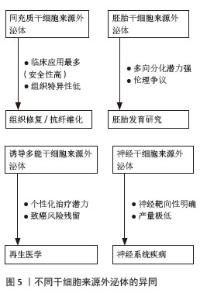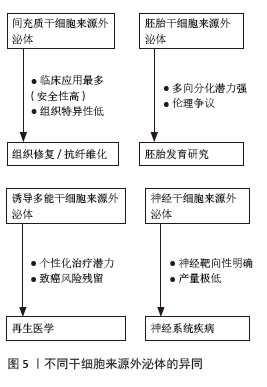 2.3 不同干细胞来源外泌体生物学特性的异同 不同干细胞来源外泌体在生物学特性、功能作用和应用潜力上存在显著差异,它们都携带来源细胞的特定蛋白质、核酸和脂质,均可以通过介导细胞间通讯,发挥免疫调节、组织修复、抗纤维化、抗凋亡、促血管生成等多种生物学效应。 间充质干细胞来源外泌体主要特点:①强大的免疫调节能力,这是间充质干细胞源外泌体最突出的特性;②显著的组织修复与再生能力,通过传递促血管生成因子促进血管新生;通过传递抗凋亡因子保护受损细胞;通过传递调节因子促进成骨、成软骨、成神经分化等;③抗纤维化:能抑制肝、肺、肾等器官的纤维化进程;④抗凋亡,保护多种组织细胞免受损伤诱导的凋亡;⑤低免疫原性与高安全性,且无细胞移植带来的潜在致瘤性和栓塞风险,临床应用安全性相对较高。间充质干细胞来源外泌体来源广泛、安全性高,是目前研究和应用最广泛、最接近临床转化的干细胞外泌体类型。 胚胎干细胞来源外泌体作用特点:①强大的促增殖与再生潜力,携带大量维持干细胞多能性和促进快速增殖的因子[19-20];②潜在的分化能力,可能携带引导特定分化的信号;③心肌保护与修复能力,在心肌梗死模型中显示出促进心肌细胞存活、减少瘢痕、改善心功能的作用;④对神经细胞有保护作用,促进神经再生。胚胎干细胞来源外泌体涉及人类胚胎,具有潜在的致瘤性风险。 诱导多能干细胞来源外泌体作用特点:携带多能性因子,具有促进细胞增殖、组织修复和再生的能力。在心肌修复、神经保护、皮肤再生等方面有报道。诱导多能干细胞外泌体来源于患者自身细胞,理论上无免疫排斥,但有致瘤性风险[21-22]。 其他组织特异性干细胞/祖细胞来源外泌体:神经干细胞来源外泌体富含神经相关因子,在促进神经突触生长、神经保护(如抗氧化、抗凋亡)、调节神经炎症方面有独特优势,应用于脑卒中、脊髓损伤、神经退行性疾病(如阿尔茨海默病、帕金森病)的研究较多。心脏祖细胞来源外泌体富含心脏发育和修复相关因子,在促进心肌细胞存活、增殖、血管新生、改善心脏功能方面有针对性效果,是心肌修复研究的热点。造血干细胞来源外泌体参与造血微环境的调节,影响造血干细胞的自我更新和分化[23-25]。见图5。 "