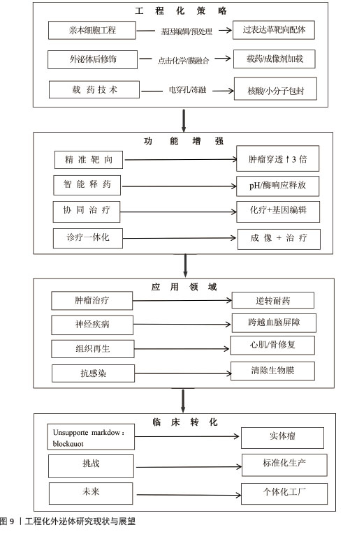 2.6 工程化外泌体:功能强化与精准治疗的新前沿 工程化外泌体通过主动修饰外泌体生物学特性(如靶向性、载药能力、稳定性),突破天然外泌体的局限性,在疾病治疗、药物递送和诊断领域展现出革命性潜力[51-52]。天然外泌体存在循环半衰期短、非特异性分布、载药效率低等缺陷,严重制约临床转化应用。针对这一瓶颈,目前通过采用靶向配体修饰技术对膜表面进行重构,提升循环稳定性和病灶靶向富集能力;功能化载药技术对外泌体内容物进行定向设计,突破递送精度壁垒、增强药物摄取效率构建多元化精准治疗模式。最新研究发现:通过外泌体功能化修饰技术能解决中药及活性成分治疗脑卒中的递送难题(如血脑屏障穿透、靶向病灶、全身不良反应),可以将大分子和治疗药物直接输送到损伤组织靶细胞,大幅提高缺血病灶部位的药物有效浓度[53-54],这为提高药物活性成分高效、精准递送,促进损伤组织再生和修复提供新的治疗策略。目前,构建功能化外泌体主要通过外泌体的表面修饰完成。外泌体的靶向修饰可以增强外泌体跨过生理屏障,实现外泌体载药对特定组织或器官的特异性递送,提高药物的递送效率和治疗效果[55]。 研究显示,c(RGDyK)肽是由精氨酸-甘氨酸-天门冬氨酸-D-酪氨酸-赖氨酸(cyclo rginine-glycineaspartate-D-tyrosine-lysine peptide)序列组成的短肽,是整合素与配体蛋白相互识别的位点,将cRGDyK修饰到骨髓间充质干细胞衍生外泌体表面,形成环(Arg-Gly-Asp-D-Tyr-Lys)肽c(RGDyK),可以提高外泌体的靶向性,可突破生理屏障实现靶向调控及髓鞘再生修复,为神经疾病治疗提供创新策略[56-57]。TIAN等[58]使用点击化学技术将c(RGDyK)肽接枝于间充质干细胞外泌体表面,发现间充质干细胞外泌体在静脉给药后可靶向至缺血性脑损伤部位;HE等[59]通过内源性负载技术对人胚肾细胞293进行工程化改造,成功制备高表达性别决定区盒基因的功能性外泌体,实验显示在脱髓鞘小鼠模型中,性别决定区盒基因高表达的功能性外泌体较未修饰外泌体不仅能特异性上调髓鞘碱性蛋白表达、增加髓鞘厚度,还可通过改善脱髓鞘微环境促进少突胶质细胞向成熟髓鞘分化,显著减轻胼胝体区域病理损伤。研究人员通过将神经生长因子及具有抗炎特性的姜黄素装载至M2型巨噬细胞外泌体之中,发现功能化外泌体具有出色的炎症调控能力与神经保护功能。HUANG等[60]装载沉默结缔组织生长因子基因小干扰RNA的间充质干细胞外泌体,并将这种外泌体尾静脉注射至脊髓损伤大鼠体内,发现间充质干细胞外泌体抑制了脊髓损伤区域神经元凋亡,促进了脊髓损伤大鼠运动功能恢复。 工程化外泌体与中药成分的整合研究仍处于探索阶段,为精准调控-协同增效-多点微调治疗提供新路径。中医药可以通过调控干细胞源性外泌体分泌、改善炎性微环境、促进损伤区抗炎-促炎平衡状态,促进少突胶质细胞参与神经修复与再生的全过程。六味地黄丸改良方补肾益髓方可通过调控外泌体多途径作用于靶点,展现促进髓鞘再生的独特药理机制:①促进miR-124并降低miR-155表达以调节靶基因水平,推动M1型小胶质细胞向M2型转化减轻神经炎症和脱髓鞘;②促进miR-15b-5p表达使其特异性结合Wnt3a mRNA阻碍翻译过程,降低Wnt3a、糖原合成酶激酶3、β-catenin表达以阶段依赖性抑制Wnt通路,促进少突胶质前体细胞分化和成熟并显著影响髓鞘形成;③促进miR-219、miR-338表达使得抑制性因子表达受阻,髓鞘碱性蛋白表达上调,从而加速少突胶质前体细胞分化并提升包裹轴突的能力[61-64],结果表明补肾益髓方通过整合微环境调控、前体细胞激活及髓鞘结构重建3个层面的治疗优势,系统促进髓鞘再生。GE等[65]基于点击化学技术将c(RKDyK)靶向肽偶联至外泌体表面构建靶向递送系统,成功实现姜黄素的药物负载,实验证实该复合体系较游离姜黄素或单纯外泌体治疗能更显著抑制脑损伤区域的炎症反应并降低细胞凋亡水平,展现出协同调控的治疗优势,见图9。 "