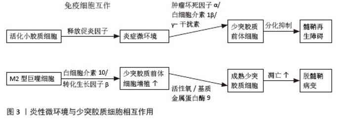 2.1 炎性微环境对少突胶质细胞修复的调控作用 2.1.1 少突胶质细胞在神经修复再生中的作用 少突胶质细胞通过生成髓磷脂以确保神经信号的高效传导,在维持轴突代谢和结构完整性中扮演着关键角色。少突胶质细胞通过轴突-髓鞘“突触”相互作用释放各种因子来给予神经元营养支持以及控制轴突生长信号。少突胶质细胞主要来源于少突胶质前体细胞和脑室下区衍生的神经干细胞,其中少突胶质前体细胞驱动的髓鞘再生过程分为3个步骤[6-8]:少突胶质前体细胞激活、增殖迁移和分化;首先脱髓鞘发生后激活为有丝分裂活跃状态并上调单羧酸转运蛋白1、性别决定区盒基因、少突细胞转录因子1/2、同源结构域蛋白NK2同源盒2等促进增殖、分化、成熟的正向基因表达以启动再生程序;其次损伤微环境中的活化神经胶质细胞感知损伤时,通过释放血小板衍生生长因子等有丝分裂原刺激少突胶质前体细胞增殖,同时通过清除髓鞘碎片分泌趋化因子引导少突胶质前体细胞向病灶定向迁移;随后在轴突电活动及表面分子的引导下,以及在脑源性神经营养因子等促分化因子、转录因子及Wnt/β-catenin信号通路、磷脂酰肌醇-3-激酶/蛋白激酶B/哺乳动物雷帕霉素靶蛋白等多信号通路调控下分化为成熟少突胶质细胞,完成髓鞘膜层状螺旋包裹与致密结构重塑,最终形成多层髓鞘结构。该过程每个阶段均受微环境信号分子与细胞内在基因程序的精密调控。 2.1.2 炎性微环境对少突胶质细胞修复的作用 炎性微环境既可以促进神经组织修复,也可以阻碍神经细胞再生。从细胞组成来看,炎性微环境主要包含促炎的M1型小胶质细胞/巨噬细胞和辅助性T细胞17(Thelper cell 17,Th17),以及抗炎的M2型小胶质细胞/巨噬细胞、淋巴细胞。在炎性微环境损伤早期,M1型细胞通过分泌肿瘤坏死因子α、白细胞介素1β和活性氧簇等递质清除细胞碎片;而在修复期,M2型细胞则通过分泌白细胞介素10、转化生长因子β等因子促进组织修复。从分子层面分析,促炎因子如肿瘤坏死因子α和白细胞介素1β可通过激活核因子κB信号通路抑制少突胶质前体细胞的分化;而γ-干扰素则通过上调MHCⅡ类分子表达增强免疫反应;抗炎因子如白细胞介素10、转化生长因子β不仅能抑制过度炎症,还能直接促进少突胶质前体细胞的成熟和髓鞘形成[9-12]。研究表明,炎性微环境与少突胶质细胞修复能力的动态平衡是决定神经损伤修复的关键因素。适度的炎症反应可以促进少突胶质前体细胞的增殖和迁移,而过度或持续的炎症反应则抑制少突胶质前体细胞分化和髓鞘形成能力[13-14]。例如,肿瘤坏死因子α可通过核因子κB信号通路抑制少突胶质前体细胞向成熟少突胶质细胞的分化。同时,炎性微环境中活性氧簇的积累也会对少突胶质细胞造成氧化损伤,进一步阻碍髓鞘修复,导致神经缺损功能难以恢复。值得注意的是,炎性微环境中的免疫细胞如M1型小胶质细胞和Th1细胞主要发挥促炎作用,而M2型小胶质细胞和调节性T细胞则具有抗炎和促修复功能[15-16]。因此,通过调节炎性微环境可以有效影响少突胶质细胞的修复活性,见图3。"