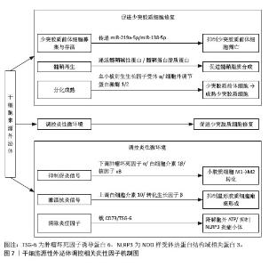 2.5 干细胞源性外泌体调控少突胶质细胞修复的机制 干细胞源性外泌体作为一种新型的细胞间通讯媒介,通过调控炎性微环境为少突胶质细胞修复创造了有利条件,作用机制涉及多种分子途径,包括miRNA介导的信号通路调节、抗炎因子分泌和免疫细胞功能调控等。这些机制共同促进了少突胶质前体细胞的增殖、分化和髓鞘形成。 2.5.1 干细胞源性外泌体调节炎性因子对少突胶质细胞修复活性的影响 在正常微环境状态下,干细胞源性外泌体通过与相邻细胞、细胞基质及多种细胞因子和激素相互作用,维持正常的自我更新能力,参与脑组织的再生和修复。异常的微环境会导致神经细胞凋亡因子、髓鞘轴突再生抑制因子的过度分泌。异常微环境不仅参与炎症介导的病理性损伤,而且参与“保护性自身免疫”。免疫微环境一方面促进少突胶质细胞再生,另一方面又抑制炎症反应减轻继发性病理损伤,为髓鞘修复提供适宜的修复环境。M1型巨噬细胞/小胶质细胞和T细胞均可分泌促炎细胞因子并相互活化,形成的炎症级联反应是导致少突胶质前体细胞分化受阻的核心机制之一。首先小胶质细胞经Toll样受体识别有害刺激后通过核因子κB核转位驱动M1型极化,分泌主导性炎症因子肿瘤坏死因子α和γ-干扰素并分别激活Caspase级联反应、FasR表达和内质网应激直接损伤少突胶质细胞;而M1型小胶质细胞可有效将高表达的组织相容性复合体分子和共刺激分子递呈给CD4?T细胞并大量增殖分化为Th1细胞、Th17细胞,经细胞间接触分泌γ-干扰素、白细胞介素17等促炎因子反向激活巨噬细胞、小胶质细胞释放毒性物质,迅速形成持续性正反馈炎症环路,加剧少突胶质细胞损伤及抗原释放,最终导致抗原扩散-脱髓鞘恶性循环[30-32]。而M2型小胶质细胞可分泌白细胞介素4、白细胞介素10及转化生长因子β等并介导信号转导和转录活化因子6磷酸化释放抗炎因子,抑制M1型活化并促进Th2、Treg细胞应答从而减少炎症对髓鞘的攻击。LI等[33]研究发现干细胞源性外泌体通过调控免疫细胞表型极化来减轻炎症反应和脱髓鞘损伤:一方面下调M1型巨噬细胞/小胶质细胞等炎症因子释放及标志物表达;另一方面上调M2型巨噬细胞/小胶质细胞表达来调控表型转换,从而减弱M1型细胞复杂的级联反应,最终构建炎症抑制性微环境,促进轴突再生和髓鞘保留实现了神经功能的保护性修复。ZHANG等[34]研究发现干细胞源性外泌体通过双重机制改善神经炎症和促进神经修复:既通过阻断Toll样受体2/ 丝氨酸/苏氨酸蛋白激酶1/核因子κB信号通路抑制M1型极化,减少下游炎症因子释放,又能增加抗炎修复M2型小胶质细胞转化,进而促进髓鞘再生,恢复神经信号的正常传导功能。另有研究发现人脂肪间充质干细胞来源外泌体对T细胞亚群分化具有显著的免疫靶向调节作用,能够快速下调致病性Th1和Th17细胞比例,并同步减少γ-干扰素、白细胞介素17A炎症因子含量,抑制炎症正反馈通路,继而调控髓鞘修复微环境促进髓鞘再生[35-37],见图7。 "
