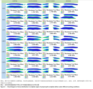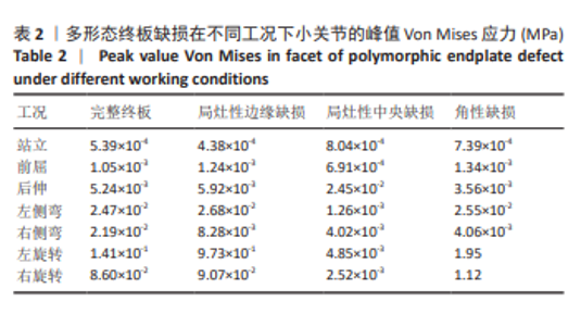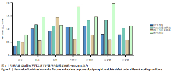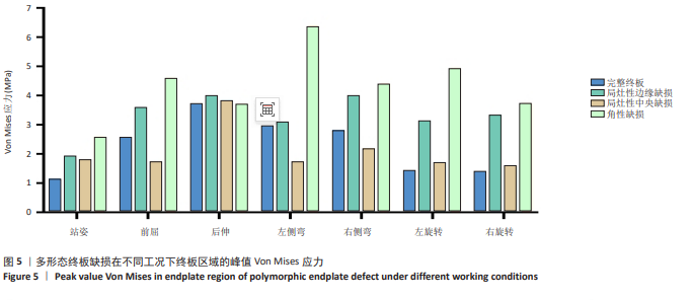 2.2 终板区域Von Mises应力分布 3种不同形态的终板缺损在不同工况下(站姿、前屈、伸展、侧弯和旋转)终板区域均表现出显著的Von Mises应力峰值和应力分布差异(图5,6)。直立站姿状态下健康完整终板呈现均匀应力分布,峰值应力较低(1.147 MPa),而缺损模型均出现不同程度的应力集中现象,其中角形缺损峰值应力最高(2.650 MPa)。局灶性边缘缺损在前屈时产生明显的应力集中(峰值3.586 MPa),较完整模型前屈工况增加28.3%。局灶性中央缺损在各工况下的应力增幅较完整健康终板较小。角性缺损在左侧弯运动时表现出最显著的应力集中(6.379 MPa),为完整终板的5.6倍,该缺损形态在所有动态载荷下均呈现广泛的高应力区分布,其中旋转运动时应力峰值达4.937 MPa,且应力集中区域与缺损的不规则边缘高度吻合(图4)。值得注意的是,缺损边缘处的应力梯度变化显著大于完整终板区域,提示这些部位可能存在更高的微损伤风险。"