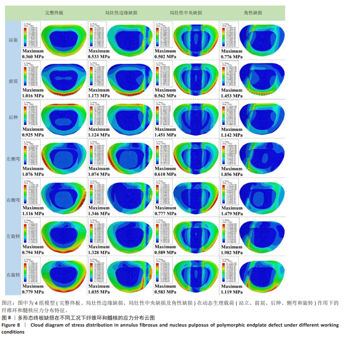 2.3 纤维环髓核Von Mises应力分布 3种不同形态终板缺损在不同工况下(站姿、前屈、伸展、侧弯和旋转)椎间盘组织(纤维环和髓核区域)的Von Mises应力峰值和应力分布云图可见图7,8,终板缺损形态显著影响纤维环和髓核的应力分布模式。完整终板模型在各类载荷下椎间盘应力分布均匀,站姿状态下的峰值应力为0.36 MPa;相比之下,缺损模型均表现出不同程度的应力异常,增幅为40%-111%。局灶性边缘缺损在前屈运动时导致纤维环外侧应力显著升高(1.173 MPa)。局灶性中央缺损在后伸动作中引起纤维环两侧后方应力集中,应力高达1.451 MPa。角性缺损在左旋转运动时产生最显著的应力异常,纤维环峰值应力达1.982 MPa,为完整模型的2.5倍。旋转运动时,所有缺损模型均呈现不对称的应力分布,其中角性缺损模型的应力梯度变化最为剧烈。特别值得注意的是,缺损模型在动态载荷下的应力峰值均出现在与缺损位置相对应的椎间盘区域,这种空间对应关系提示终板缺损可能通过改变局部力学环境直接影响椎间盘的载荷传递路径。此外,角性缺损模型在所有工况下均表现出最高的应力集中系数,进一步证实此类缺损形态对椎间盘力学环境的破坏最为严重。"
