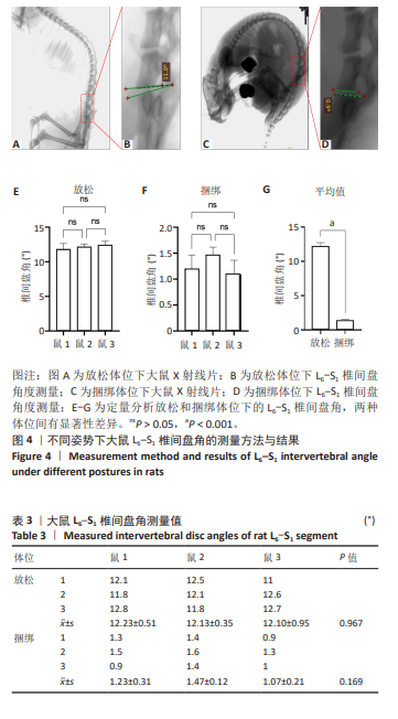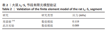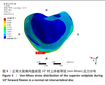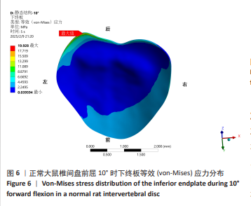 RESULTS AND CONCLUSION: (1) The mean L6-S1 intervertebral disc angle was (12.16±0.57)° in the relaxed posture and (1.26±0.26)° in the restrained posture. (2) Under a 10° forward-flexed posture, the maximum von-Mises stress in the superior endplate, inferior endplate, annulus fibrosus, and nucleus pulposus of the L6-S1 intervertebral disc was 10.398, 19.928, 6.819, and 0.104 MPa, respectively. The maximum von-Mises stress in the superior and inferior endplates was significantly higher than in the annulus fibrosus and nucleus pulposus. (3) These findings suggest that in the 10° flexion modeling posture of the L6-S1 intervertebral disc, the reduction of the L6-S1 intervertebral disc angle leads to significant changes in disc morphology and load distribution. The constructed finite element model successfully simulated the biomechanical environment of the L6-S1 intervertebral disc under abnormal forward-flexed posture in rats. The superior and inferior endplates bear higher equivalent stress in this posture, making them the structures most likely to undergo early degenerative changes.