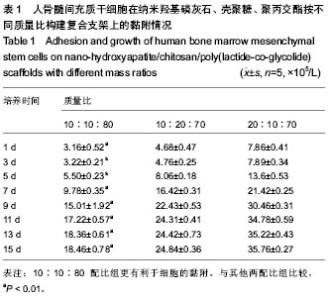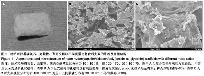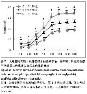 2.1 支架外观及孔隙率的测定 3种支架均为乳白色,内部及表面充满多孔状结构。应用排水法测量3种支架孔隙率均大于80%。扫描电镜可以观察到纳米羟基磷灰石/壳聚糖/聚丙交酯支架孔表面均匀分布有纳米羟基磷灰石及壳聚糖颗粒,3组支架内部孔结构没有明显差异;3种支架孔径分布均以100-300 µm为主,其间散在分布有30-50 µm不等的微孔(图1)。采用Digmizer图像测量软件测量3组复合支架孔隙的平均孔径分别为(224.14±86.47),(221.14±23.10),(226.19±47.35) µm,结果没有统计学差异,孔径大小均符合引导骨生长的支架最佳孔径。10∶10∶80、10∶20∶70组及20∶10∶70组支架抗压缩实验测试结果分别为(6.078±0.111),(4.586 ±0.159),(10.898±0.119) MPa,显示3组支架的抗压强度均与人平均松质骨抗压强度0.5-11.0 MPa相当[12]。而20∶10∶70组支架抗压强度明显大于其他两组(P < 0.01)。 2.2 人骨髓间充质干细胞与支架复合后的体外实验 细胞在支架上的黏附率及生长曲线:细胞复合 20∶10∶70支架组在第1天的黏附率及之后各个时间点测定的细胞增殖率均显著高于10∶10∶80组及10∶20∶70组(P < 0.01),见表1。3组支架的细胞增殖趋势相似,第1-3天为潜伏期,第3天进入对数增殖期,第9天后基本进入平台期(图2)。"