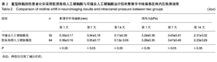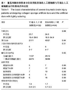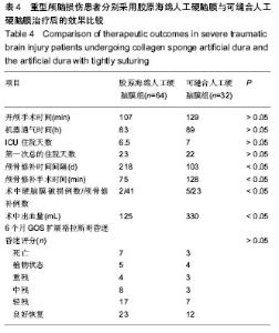 RESULTS AND CONCLUSION: The same purpose was achieved in the two groups. The amount of bleeding during hematoma clearance, postoperative mechanical ventilation time, monitoring time in ICU, the total number of hospitalized days and Glasgow Coma Scale score of 6 months postoperatively showed no significant difference between the two groups (P > 0.05). But operative time for hematoma clearance and cranioplasty as well as blood loss in the second operation were statistically significant between two groups (P < 0.05). The collagen sponge artificial dura in severe traumatic brain injury can fully play a good role in reducing intracranial pressure, keeping brain functions, shortening operative time, and improving outcomes of patients, which has similar effects to tightly suturing the dura and creates favorable conditions for the following cranioplasty.