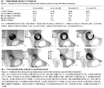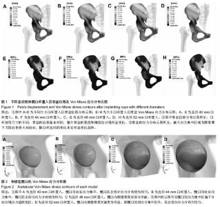 试验基于临床发育性髋关节脱位患者的术前三维CT 图像,建立了CroweⅡ型骨盆三维有限元模型。模型较精细,包括410 164个节点,264 187个单元,变形髋臼位置显示清晰。模拟患侧单下肢站立的情况,对骨盆受力情况进行初步分析。 2.1 各模型骨盆位移及应力分布变化 在设定了一定的约束之后,骨盆在受到力学加载后可能会出现沿冠状面或矢状面的位移,从而会影响到关节的力学环境。从图1A-D中可以看出各模型的位移情况,在此种载荷条件下骨盆的最大位移在髂骨翼的后部。臼杯使用尺寸的不同,骨盆的位移基本相同。大杯打磨掉更多的骨质使得髋臼处骨质变薄,但就整个骨盆的强度和刚度而言没出现明显下降。 而就整个骨盆的应力分布云图所见(图1E-H),最大应力集中区域为髂骨翼下方接近坐骨大切迹处,随臼杯直径的变化未见明显变化趋势(表2)。 2.2 各模型髋臼Von Mises应力分布变化 通过应力云图可以看到,由于髋臼骨床形态学的改变,单腿站立时应力主要集中在髋臼顶部及内侧壁。各模型髋臼上的Von Mises应力比较,从髋臼峰值Von Mises应力的比较看,44 mm臼杯模型最小,随臼杯直径的加大,应力峰值加大。对比整个臼杯的受力情况,40 mm臼杯置入后,除髋臼顶外,髋臼其余部分应力分布较为均匀,这在44 mm臼杯置入模型中同样可见,同时因44 mm直径臼杯较40 mm直径臼杯接触面积更大,单位面积所受应力相对较少。至48 mm直径臼杯置入模型,因髋臼内侧已有部分突破,云图可见髋臼顶应力集中区偏下方处出现应力值较低区,此区域在 52 mm直径臼杯置入模型因骨质突破更为明显而有所扩大,使得除髋臼顶部应力集中区外,其余部分应力分布欠均匀(图2,表2)。"