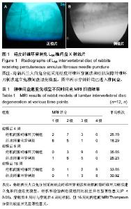 RESULTS AND CONCLUSION: At 4 weeks after the puncture, T2-weighted image signal reduced, darken, and disc height decreased in rabbit nucleus pulposus of the two groups. T2 signal intensity scores were lower in the percutaneous annulus fibrosus needle puncture group compared with the muscular annulus fibrosus knife penetration group (P < 0.05). At 8 weeks after puncture, T2 signal intensity scores were increased in both groups. T2 signal intensity scores were lower in the percutaneous annulus fibrosus needle puncture group compared with the muscular annulus fibrosus knife penetration group (P < 0.05). At 16 weeks after puncture, T2 signal intensity reached a peak, and no significant difference was detected between the two groups. Intervertebral space became significantly narrowed. The brightness of the disc became black. There were no significant differences between