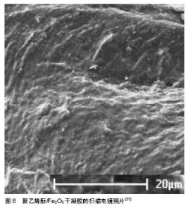 2.1.4 磁敏感性水凝胶 磁敏感性水凝胶是指具有磁响应性的一类环境敏感性水凝胶。张书第等[21]采用循环冷 冻-解冻方法制备了聚乙烯醇/Fe2O3磁敏感性水凝胶,其干凝胶的扫描电镜照片见图6,观察水凝胶各个方面性能发现:当Fe2O3含量在1%(ω)时水凝胶的力学性能相对较好;当水凝胶的磁场强度在30 000 e时表现出来的顺磁性说明其具有较好的磁敏感性。Satarkar等[22]用外光辐照引发聚合制备了PNIPAAm/Fe3O4磁敏感性水凝胶。他们将一定浓度的NIPAAm溶液与交联剂二甲基丙烯酸聚乙二醇(400)酯(PEG400DMA)、Fe3O4(粒径为20-30 nm) 按照一定比例混合,加入光引发剂安息香双甲醚,用紫外光辐照使其凝胶化。产物在去离子水中浸泡,经多次洗涤除去杂质,得到具有温度/磁场双重敏感性的水凝胶。通过改变磁性粒子的含量可以对这种磁性超分子水凝胶的力学性能进行调控。Paulino等[23]以交联壳聚糖/共聚合反应和丙烯酸在N,N’-亚甲基双丙烯酰胺下与柠檬酸盐包裹的Fe3O4进行交联,通过X射线衍射证实水凝胶的溶胀率与离子强度相关联。"