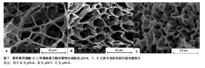 2.1.5 温度/pH双重敏感性水凝胶 同时对两种或两种以上外界刺激产生反应的智能凝胶已成为高分子缓释载体的发展方向,因pH和温度是生理生化系统中的两个重要因素,研究具有pH和温度双重敏感的水凝胶作为新型高分子材料已备受关注。Shim等[24]通过添加pH/温度敏感部分嵌段共聚物制备了一种新型的pH/温度双重敏感水凝胶,pH值在7.4-8.0变化。该溶液在pH=7.4(人体)、37 ℃形成凝胶时,可作为疏水性药物和蛋白注射的载体,并且可用来作为一个注射输送系统模板技术。陆遥遥等[25]以N-异丙基丙烯酰胺与海藻酸钠为原料,运用水溶液聚合法研制了具有温度和pH值双重敏感性的海藻酸钠/聚(N-异丙基丙烯酰胺)水凝胶。考察了在不同温度和pH值条件下,反应温度、单体浓度、交联剂用量等对该凝胶溶胀度的影响,实验表明凝胶具有良好的温度和pH敏感性能。Sun等[26]将N-异丙基丙烯酰胺和聚乙二醇(相对分子质量2 000)共混制备了具有温度和pH性双重敏感性的水凝胶薄膜,差示扫描量热法研究表明,物理共混膜表现出较低的临界溶液温度及pH值敏感性。余娟等[27]以甲基丙烯酸-2-二甲基胺基乙酯为单体,N,N’-亚甲基双丙烯酰胺为交联剂,过硫酸钾为引发剂,在35 ℃(接近人体温度)条件下,采用自由基水溶液聚合合成了聚甲基丙烯酸-2-二甲基胺基乙酯均聚物水凝胶,所合成的水凝胶具有温度和pH双重敏感性(图7)。Khurma等[28]用壳聚糖水凝胶和聚乙二醇为原料制备pH和温度双重敏感水凝胶,观察温度25,37,45 ℃时在去离子水中水凝胶的溶胀行为,利用差示扫描量热法测定了37 ℃下水凝胶在去离子水中的状态,发现其溶胀率随着凝胶中聚乙二醇浓度的增加而增加。"