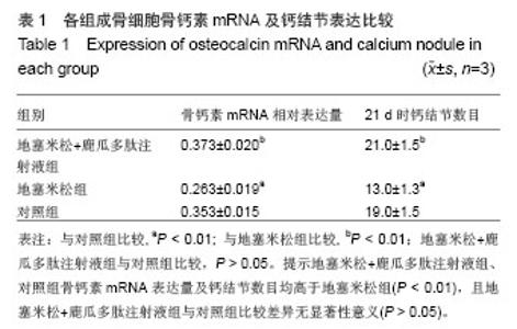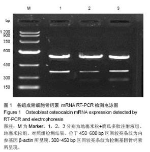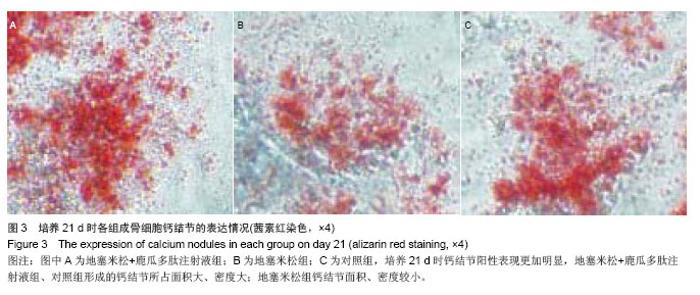 METHODS: The rat osteoblasts were randomly divided into three groups. Lugua peptide plus dexamethasone group was injected with 1×10-7 mol/L dexamethasone, 8 mg/L Lugua peptide and dimethyl sulfoxide (final concentration 1 g/L). Dexamethasone group was injected with 1×10-7 mol/L dexamethasone and dimethyl sulfoxide (final concentration 1 g/L). Control group was injected with dimethyl sulfoxide (final concentration 1 g/L). After 96 hours, the expression of osteocalcin was analyzed by RT-PCR analysis; at 21 days, the expression of calcium nodules was observed by alizarin red staining.
