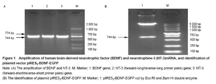Amplification of BDNF and NT-3 genes BDNF and NT-3 genes were obtained from the genomic DNA of human peripheral blood mononuclear cells by PCR. The size of BDNF gene was 744 bp, the size of NT-3 gene was 774 bp (Figure 1A). Identification of plasmid pIRES2-BDNF-EGFP The plasmid pIRES2-BDNF-EGFP was cut by EcoRI and Bam HI double enzyme. A gene fragment with 744 bp was obtained, which was in full agreed with BDNF gene (NM-001102654.1) (Figure 1B). "