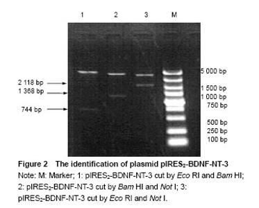 Identification of plasmid pIRES2-BDNF-NT-3 The plasmid pIRES2-BDNF-NT-3 was cut by Eco RI and Bam HI double enzyme. And a fragment about 744 bp would be obtained. This indicated BDNF gene was inserted into the plasmid pIRES2-BDNF-NT-3. The plasmid pIRES2-BDNF-NT-3 was cut by Bam HI and Not I double enzyme. And a fragment about 1 368 bp would be obtained. This indicated IRES-NT-3 gene was inserted into the plasmid pIRES2-BDNF-NT-3. The plasmid pIRES2-BDNF-NT-3 was cut by Eco RI and Not I double enzyme. And a fragment about 2 118 bp would be obtained. This indicated that BDNF-IRES-NT-3 gene was inserted into the plasmid pIRES2-BDNF-NT-3. The sequence of the plasmid pIRES2-BDNF-NT-3 was in accordance with gene sequence in Gene Bank (Figure 2). "