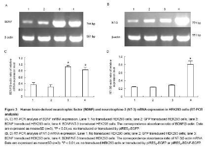 RT-PCR analysis of BDNF and NT-3 mRNA expression in HEK293 cells To illustrate mRNA expression by pIRES2-EGFP, pIRES2-BDNF/EGFP and pIRES2-BDNF/NT-3 transduced HEK293 cells, we evaluated the expression of BDNF and NT-3 by RT-PCR analysis. RT-PCR was performed using BDNF-specific primers and the β-actin sequence served as an internal standard. GFP expression was monitored in pIRES2-EGFP and pIRES2-BDNF/EGFP transduced HEK293 cells by inverted fluorescence microscopy. Expression of BDNF mRNA was higher in either pIRES2-BDNF/EGFP or pIRES2-BDNF/NT-3 transduced HEK293 cells than that pIRES2-EGFP transduced HEK293 cells or negative control (P < 0.01; Figure 3A, C). As shown above, expression of NT-3 mRNA was higher in pIRES2-BDNF/NT-3-transduced HEK293 cells than the other three (P < 0.01; Figure 3B, D). These results demonstrated that the BDNF and NT-3 had been introduced successfully into HEK293 cells by pIRES2-BDNF/EGFP and pIRES2-BDNF/NT-3."