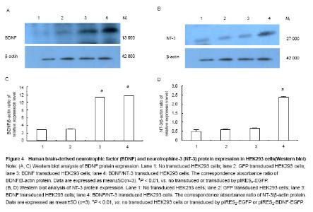 Western blot analysis of BDNF and NT-3 expression in HEK293 cells To illustrate protein expression by pIRES2-EGFP, pIRES2-BDNF/EGFP, and pIRES2-BDNF/NT-3 transduced HEK293 cells, we evaluated the expression of BDNF and NT-3 by western blot assay. After 72 hours of transduction, we collected the culture supernatants of infected HEK293 cells without serums which were processed for western blot analysis using an anti-BDNF and anti-NT-3 antibody. The β-actin served as an internal standard. The results suggested that exogenous BDNF protein was strongly expressed in pIRES2-BDNF/EGFP and pIRES2-BDNF/NT-3 transduced HEK293 cells, but the pIRES2-EGFP transduced HEK293 cells and no transduced expression of endogenous BDNF was very low (P < 0.01; Figure 4A, C). As shown above, western blot analysis also revealed that exogenous NT-3 protein was strongly expressed in pIRES2-BDNF/NT-3 transduced HEK293 cells, and the pIRES2-EGFP, pIRES2-BDNF/EGFP transduced HEK293 cells expression of endogenous NT-3 was very low (P < 0.01; Figure 4B, D). These results also demonstrated that BDNF and NT-3 had been introduced successfully into HEK293 cells by pIRES2-BDNF/NT-3. "