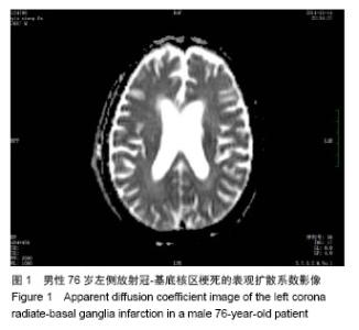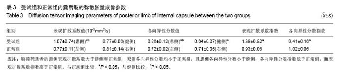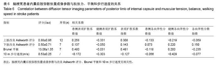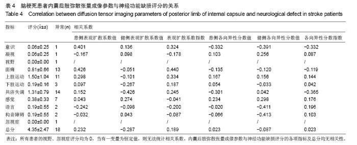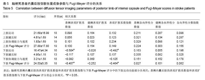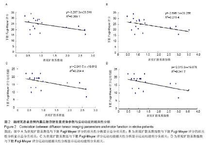 2.5 患者弥散张量成像参数与运动功能的相关性分析 脑梗死患者内囊后肢弥散张量成像参数与神经功能损伤 (NIHSS)无相关性(表4)。脑梗死患侧内囊后肢的表观扩散系数值和表观扩散系数指数与下肢Fugl-Meyer评分的总分负相关(分别为r=-0.457,P=0.049和r=-0.464,P=0.045,表5,图2A,B),而与改良Ashworth评分、Brunel平衡、步行速度、上肢Fugl-Meyer评分无相关性(P > 0.05)。患侧内囊后肢的表观扩散系数值和表观扩散系数指数与下肢Fugl-Meyer评分中的下肢运动功能部分负相关(分别为r=-0.504,P=0.028和r=-0.492,P=0.033,表5,图2C,D),与下肢Fugl-Meyer评分的下肢协调能力与速度、下肢腱反射无相关性。健侧表观扩散系数值、健侧各向异性分数值、患侧各向异性分数值和各向异性分数指数与运动功能的各项参数均无相关性(P > 0.05)。"