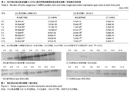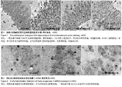 RESULTS AND CONCLUSION: There were few positive cells for heme oxygenase-1 mRNA expression in the air control group, with light staining; but a large number of positive cells for heme oxygenase-1 mRNA expression in CO poisoning group, with deep staining. The heme oxygenase-1 mRNA expression was increased at 1 days (P < 0.01), reached a peak at 3 days (P < 0.01), decreased at 5 days (P < 0.01), and still higher than air control group at 21 days (P < 0.01). Changes of heme oxygenase-1 protein expression were consistent with heme oxygenase-1 mRNA expression. The upregulated expression of heme oxygenase-1 mRNA and protein plays a crucial role in the pathogenesis of delayed encephalopathy after CO poisoning.