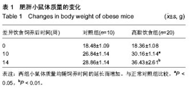 METHODS: Male C57BL/6J mice were randomly divided into control group and high fat diet group, and fed for 14 weeks separately. The mice of the two groups were weighed. Mice in high fat diet group whose body weight were 20% higher than average weight of control mice were selected as obese mice.