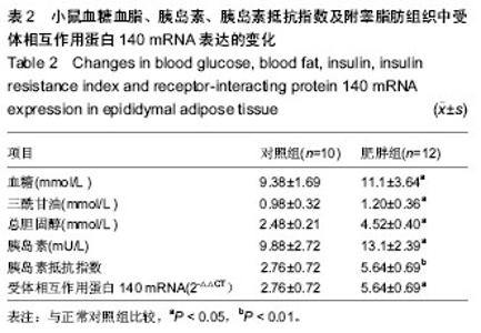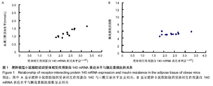 RESULTS AND CONCLUSION: A total of 12 mice in high fat diet group were recruited into the obesity group. The levels of triglycerides, total cholesterol, fast blood glucose and fast insulin in obesity group were significantly higher than those of control group (P < 0.05 or P < 0.01). The expression of receptor-interacting protein 140 mRNA in adipose was significantly higher in obesity group compared with the controls (P < 0.05). Moreover, the expression of receptor-interacting protein 140 mRNA in adipose was positively correlated with triglycerides levels and insulin resistance index (r=0.526, P < 0.05; r=0.465, P < 0.05), but negatively associated with the levels of total cholesterol, fast blood glucose and fast insulin (P > 0.05).