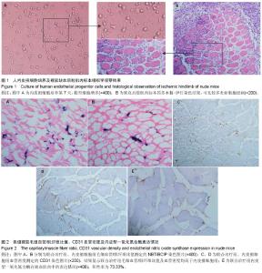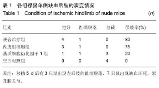 2.1 实验动物数量分析 4组共纳入20只裸鼠,死亡2只,原因为1只静脉注射内皮祖细胞时注液过多导致心衰死亡,另一只死亡原因不明。 共18只裸鼠进入结果分析,联合治疗组、内皮祖细胞组、基质细胞衍化因子1组及空白对照组分别为5,4,5,4只。 2.2 人内皮祖细胞的培养 单个核细胞多数呈小圆细胞形态,经内皮条件下培养,48 h后出现贴壁,培养第3天可见部分贴壁细胞呈梭形或不规则形,以后贴壁细胞逐渐变大变圆,至第7天梭形细胞增多(图1A)。20 mL外周血可分离得到单个核细胞约5×106个。 2.3 裸鼠缺血后肢演变情况 18只裸鼠缺血下肢演变情况见表1。 移植后3 d缺血的左后肢皮温较低,5 d后有3只鼠出现左后肢的趾端脱落,7只鼠出现缺血坏死,累及膝关节。坏死处未见明显感染迹象。标本经苏木精-伊红染色发现,有缺血坏死的后肢肌肉标本苏木精-伊红染色可见较多炎症细胞浸润(图1B)。"