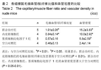 2.3 毛细血管/肌纤维比值的测定 在骨骼肌中有生命力的毛细血管内皮细胞表达内源性碱性磷酸酶,当NBT/BCIP作为底物显色时,有生命力的内皮细胞即显示蓝紫色颗粒(图2A,B)。 方差分析显示联合治疗组、内皮祖细胞组、基质细胞衍化因子1组和空白对照组毛细血管/肌纤维比值差异有显著性意义。两两比较联合治疗组、内皮祖细胞组显著高于空白对照组(P < 0.01),基质细胞衍化因子1与空白对照组差异无显著性意义。联合治疗组高于内皮祖细胞组、内皮祖细胞组高于基质细胞衍化因子1组(P < 0.05,表2)。 2.4 血管密度检测 以CD31染色阳性表示血管密度。在细胞膜和细胞浆出现棕黄色颗粒为CD31阳性(图2C,D)。在200倍光镜下,每张切片随机计数5个视野内的棕黄色管状数,取其平均值。经检验,联合治疗组和内皮祖细胞组显著大于空白对照组(P < 0.01),基质细胞衍化因子1组显著大于空白对照组(P < 0.05),联合治疗组显著大于内皮祖细胞组、内皮祖细胞组显著大于基质细胞衍化因子1组(P < 0.05,表2)。"