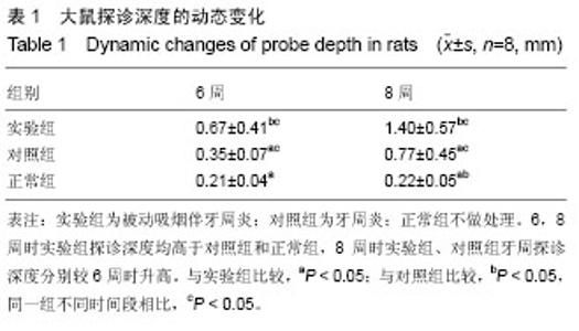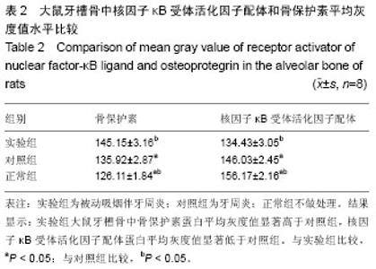 METHODS: A total of 24 rats were randomly divided into three groups. Normal group: rats were normally fed without any other pre-treatment; Control group: experimental periodontitis model was established using wire ligation method in rats; Experimental group: rat models were given passive smoking during experimental modeling period. All rats were sacrificed after 8 weeks of modeling, periodontal tissue were removed. Hematoxylin-eosin staining was used for examining pathological changes in periodontal tissue, and immunohistochemical analysis was done for observing receptor activator of nuclear factor-κB ligand and osteoprotegrin expression.