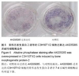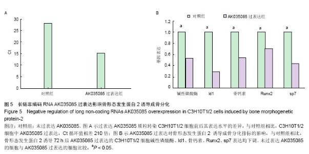 Id1,osteocalcin, Runx2, sp7 expression were increased (P < 0.05). There were 24 down-regulated lncRNAs identified between bone morphogenetic protein-2 treated and untreated groups, the decrease of expression was 1.5 folds, and among them, only AK035085 contained intron. Compared with control group with no AK03508 expression, over-expression lncRNA AK035085 decreased the expression of alkaline phosphatase, Id1, osteocalcin, Runx2, sp7   (P < 0.05). Experimental findings indicate that bone morphogenetic protein-2 induces osteogenic differentiation of C3H10T1/2 cells and AK035085 inhibits the osteogenic differentiation.