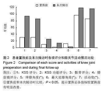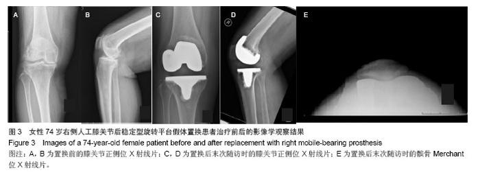 2.4 X射线评估结果 Merchant位X射线测得患者髌股关节对合角和髌骨倾斜角分别为(5.48±2.25)°,(11.23±3.22)°。 2.5 典型病例 74岁女性右膝骨关节炎患者,2007年1月予行右侧人工膝关节后稳定型旋转平台假体置换治疗,2014年1月末次随访,膝关节各项评分及关节活动度和伸屈效果满意,未出现假体松动、髌骨弹响等不良情况。X射线图像见图3。 2.6 不良事件 1例骨关节炎患者于住院间出现早期关节内感染,予以打开关节腔清理后治愈,未行翻修手术。2例患者出现下肢深静脉血栓,予以固定、低分子肝素应用加倍治疗(2次/d)后好转。所有患者均未出现聚乙烯垫片脱出。2例患者(共2膝)出现髌骨弹响。 "