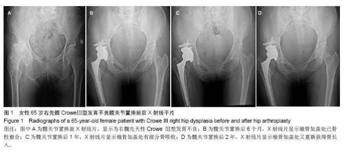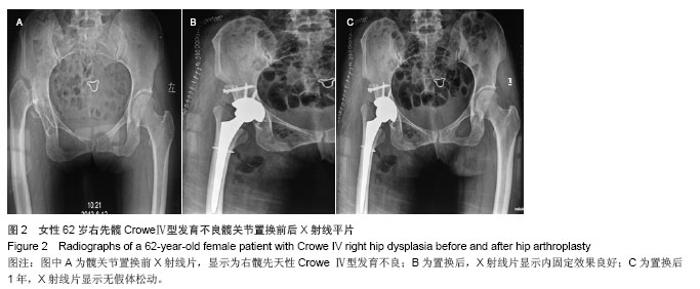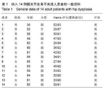 METHODS: A total of in 14 patients with adult hip dysplasia were retrospectively analyzed. According to Crowe method, there were 11 cases of type III and 3 cases of type IV. All patients underwent total hip arthroplasty. Autologous femur neck was used to make an onlay bone graft around the acetabulum during replacement. Radiographs were analyzed after replacement and during follow-up. Clinical efficacy was assessed using Harris standard.