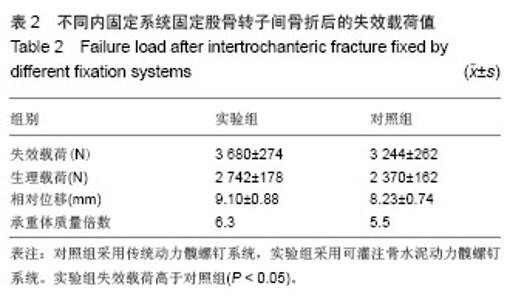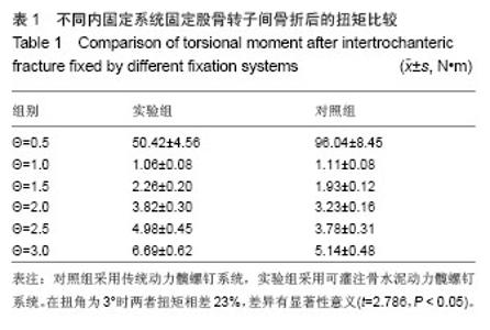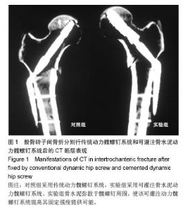 RESULTS AND CONCLUSION: Stress intensity, axial stiffness and horizontal shear stiffness were higher in the experimental group than in the control group (P < 0.05). At torsion angle of 3°, torsional moment was higher in the experimental group than in the control group (P < 0.05). Fatigue load was higher in the experimental group than in the control group (P < 0.05). Results suggested that cemented dynamic hip screw internal fixation system in the  treatment of senile osteoporotic intertrochanteric fracture can effectively enhance the hip screw holding force and prevent femoral cutting. Biomechanical property, stiffness, endurance resistance and stability of cemented dynamic hip screw are better than traditional dynamic hip screw.