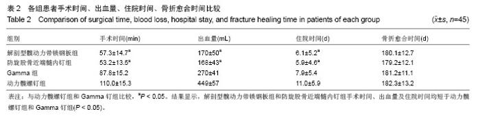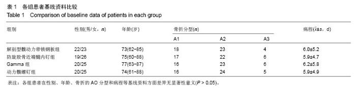 METHODS: 180 old patients with femoral intertrochanteric fractures treated from September 2009 to September 2012 were analyzed. Four kinds of metal implants were used for repair of fracture. There were 45 patients in the dynamic hip screw group, proximal femoral nail anti-rotation group, Gamma nail group and anatomical dynamic hip lock nickelclad group, separately. Operation time, blood loss, hospital time, Harris score after operation, fracture healing time and complications in different groups were compared.