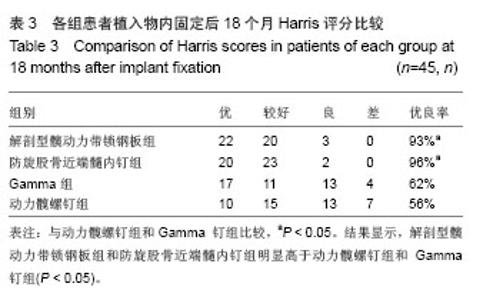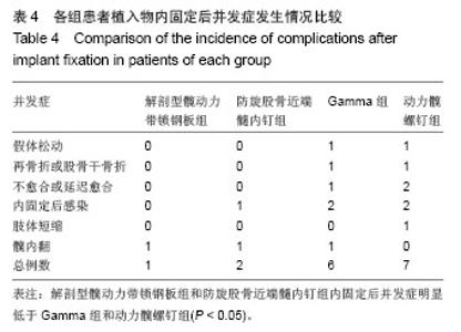 RESULTS AND CONCLUSION: Operation time and hospital time were shorter, and blood loss was fewer in the  anatomical dynamic hip lock nickelclad group and proximal femoral nail anti-rotation group compared with the dynamic hip screw group and Gamma nail group (P < 0.05), but the excellent and good rate of Harris score after operation was higher (P < 0.05). No significant difference was detected between anatomical dynamic hip lock nickelclad group and proximal femoral nail anti-rotation group (P > 0.05). The incidence of complications was significantly lower in the anatomical dynamic hip lock nickelclad group and proximal femoral nail anti-rotation group compared with the Gamma nail group and dynamic hip screw group (P < 0.05). Results suggested that anatomical dynamic hip lock nickelclad and proximal femoral nail anti-rotation are reliable in treatment of intertrochanteric fracture in old patients, show less postoperative complications, and are ideal choices for implant fixation of femoral intertrochanteric fracture in old patients.