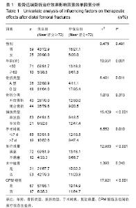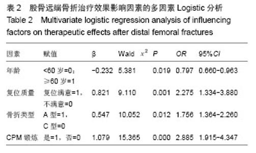 2.1 可能影响临床疗效的因素 将可能影响髁部支撑钢板治疗股骨远端骨折效果的相关因素分组如下:①性别:男性组和女性组。②年龄:< 60岁组,≥60岁组。③骨折类型:依据AO/ASIF分类法将股骨远端骨折分为A型组和C型组。④骨折分类:开放骨折组和闭合骨折组。⑤损伤类型:按是否合并多发伤分为单发伤组和多发伤组。⑥手术时机:按受伤至手术时间分为≤7 d组和>7 d组。⑦骨折复位质量:满意组和不满意组,以骨折解剖复位或膝关节冠状面(内外翻)小于7°畸形,在矢状面(前后)不超过7°-10°畸形为满意,否则为不满意。⑧术中是否植骨:植骨组和未植骨组。⑨钢板置入后是否行石膏制动:未行石膏制动组和行石膏制动组。⑩钢板置入后有无行CPM锻炼:分为行CPM锻炼组和未行CPM锻炼组。依据Neer膝关节功能评分表评分进行分组[23],优良组:评分≥72分,非优良组:评分<72分。 2.2 临床疗效影响因素的单因素分析 84例患者中,Neer评分为优良和非优良的分别为63例(75%)和21例(25%),对可能影响临床疗效的因素进行单因素分组分析,结果显示,年龄、骨折类型、损伤类型、手术时机、复位质量、CPM锻炼各组间临床疗效存在差异(P < 0.05,表1)。"
