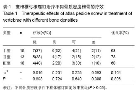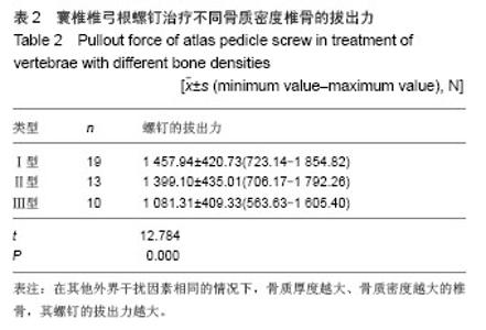 METHODS: A total of 42 fresh vertebrae were obtained from Department of Human Anatomy, Basic Medical School, Inner Mongolia Medical University. In accordance with bone thickness of sagittal vertebral artery groove bottom, vertebrae were divided into three types: type I (common type), type II (light variation), and type III (severe variation). All samples were subjected to atlas pedicle screw fixation.