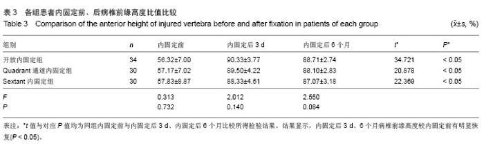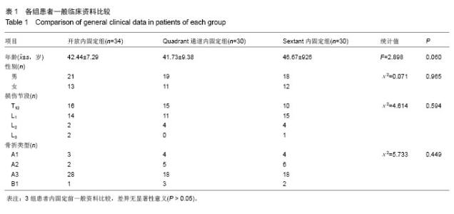 2.1 参与者数量分析 按意向性分析,纳入94例单节段无神经症状胸腰椎骨折患者,分为3组,全部进入结果分析,无脱落。所有患者随访6个月。 2.2 基线资料比较 3组患者例数相仿,开放内固定组34例,Quadrant通道内固定组30例,Sextant内固定组30例。受伤平均年龄超过40岁,男性(57例)多于女性(37例)。受伤最多部位在T12(41例)和L1(40例),L2及L3较少,分别为10例和3例。骨折主要为A3型骨折,即爆散型骨折,达64例;其他骨折类型A1型11例,A2型13例,B1型6例。 3组患者内固定前一般资料,包括年龄、性别、损伤节段、骨折类型比较,差异无显著性意义(P > 0.05,表1)。"
