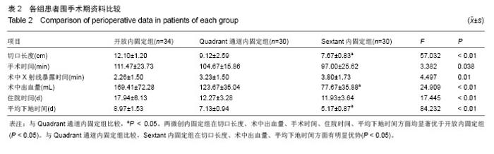 2.3 围手术期结果比较 3组手术方式的切口长度均数,开放内固定组最长,Quadrant通道内固定组次之,Sextant内固定组最短。平均手术时间,开放内固定组手术时间最长。术中出血量Sextant内固定组最少。在这3组病例中,没有进行输血治疗。术中X射线暴露时间最短为开放内固定组,Sextant内固定组最长。在平均住院时间方面,Sextant内固定组最短,开放内固定组最长。平均下地时间,Sextant内固定组最短。 微创与开放内固定组围手术期指标比较,Quadrant通道内固定组、Sextant内固定组在切口长度、术中出血量、手术时间、住院时间、平均下地时间方面均显著优于开放内固定组(P < 0.05,表2)。"