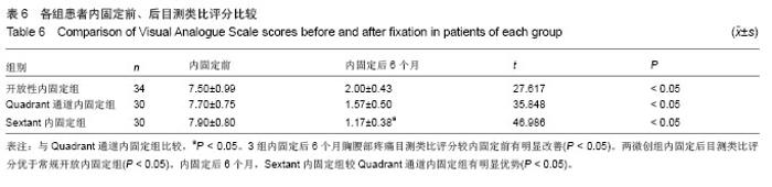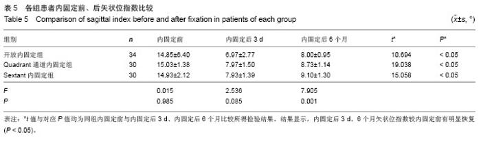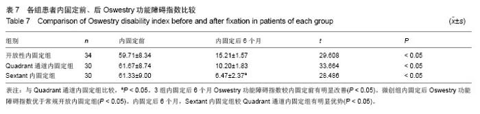 2.5 临床疗效结果比较 内固定后6个月全部患者均有恢复,胸腰部疼痛目测类比评分、Oswestry功能障碍指数均下降。临床疗效指标比较,内固定后6个月胸腰部疼痛目测类比评分、Oswestry功能障碍指数较内固定前有明显改善,差异有显著性意义(P < 0.05)。内固定后6个月,Quadrant通道内固定组、Sextant内固定组与开放性内固定组比较,差异有显著性意义(P < 0.05,表6,7)。 2.6 两微创组之间指标比较 Quadrant通道内固定组与Sextant内固定组围手术期指标比较:与Quadrant通道内固定组比较,Sextant内固定组在切口长度、术中出血量、平均下地时间方面有明显优势(P < 0.05,见表2)。 Quadrant通道内固定组与Sextant内固定组目测类比评分及Oswestry功能障碍指数比较:对于目测类比评分及Oswestry功能障碍指数,两组间内固定前差异无显著性意义(P > 0.05);而内固定后6个月比较,Sextant内固定组较Quadrant通道内固定组有明显优势(P < 0.05,见表6,7)。 2.7 不良事件 所有病例未出现脊髓、神经根、血管或者脏器损伤的情况。内固定后3 d复查CT椎弓根位置,开放内固定组螺钉破椎弓根壁约2例,Quadrant通道内固定组破椎弓根内侧壁1例,Sextant内固定组破椎弓根外侧壁1例。 "
