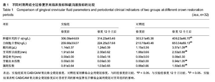 METHODS: Sixty-four abutments of 55 patients were randomly divided into two groups: the experimental group included 32 abutments of 29 patients which would be restored by CAD/CAM zirconia all-ceramic crowns; the controlled group included 32 abutments of 26 patients which would be restored by Ni-Cr alloy porcelain-fused-to- metal restorations. The volume of gingival crevicular fluid and the levels of interleukin-6 and tumor necrosis factor-α in the two groups were examined at the pre-restoration and post-restoration stages. Meanwhile, periodontal clinical indicators, including sulcus bleeding index, probing depth, plaque index and attachment loss were recorded.