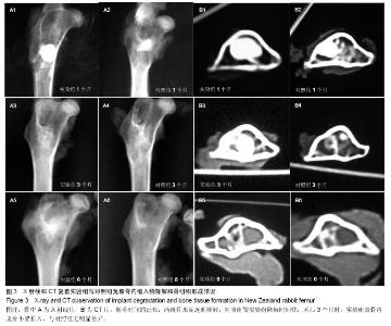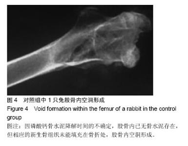 2.5 组织学检测 标本在脱钙过程中磷酸钙骨水泥丢失,因此未能显示出新生骨组织与磷酸钙骨水泥及球囊的关系,脱钙苏木精-伊红染色病理图片只是显示出成骨细胞活跃,骨组织周围无明显免疫反应。硬组织切片显示:①实验组:术后1个月时有小的骨组织通过球囊膜进入磷酸钙骨水泥孔隙内;3个月时球囊膜变薄,磷酸钙骨水泥内见广泛分布的骨髓组织;6个月时骨小梁交织成网状,其内少量磷酸钙骨水泥残留。②对照组:术后1个月时显示骨组织与磷酸钙骨水泥结合紧密,有骨组织探入磷酸钙骨水泥孔隙内,3个月时进入磷酸钙骨水泥内的骨组织增多,6个月时骨小梁已进入磷酸钙骨水泥内交织成网。两组在术后1个月时均见有骨组织进入磷酸钙骨水泥孔隙,差异性不明显;3个月时实验组新骨生长情况较对照组活跃,6个月时实验组骨小梁增生情况明显优于对照组,见图5。"