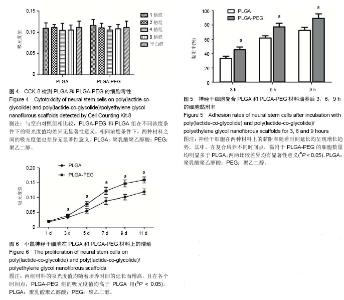 RESULTS AND CONCLUSION: Interconnected porous network structure was observed in both two kinds of scaffolds under the scanning electron microscope. Fiber diameters and porosities of PLGA and PLGA-PEG scaffolds showed no significant differences (P > 0.05). Cell Counting Kit-8 detection showed neural stem cells grew well on both two kinds of scaffolds and the absorbance value of two groups increased continuously with incubation time (1, 3, 5, 7, 9, 11 days). And there were statistically significant differences in the absorbance values between two groups at each time point (P < 0.05). Moreover, the cell adhesion rate was significantly higher in the PLGA-PEG group than in the PLGA group at 3, 6, 9 hours of culture (P < 0.05). Hoechst 33342 staining showed normal morphology and quality of the nuclei, and significantly more cells were observed in the PLGA-PEG group than the PLGA group (P < 0.05). Under the scanning electron microscope, compared with the PLGA scaffold, the PLGA-PEG scaffold was better for growth and matrix secretion of neural stem cells. In conclusion, PLGA-PEG nanofibrous scaffolds prepared by electrospinning are safe, non-toxic and suitable for neural stem cells growth with well biocompatibility, appropriate aperture and porosity.