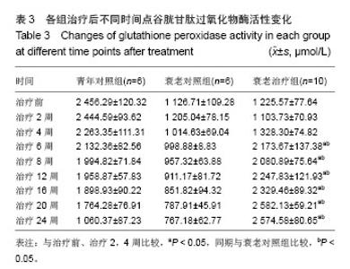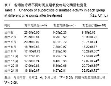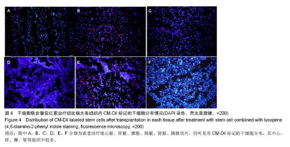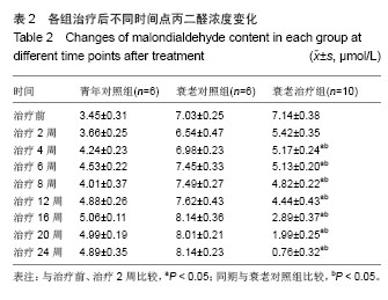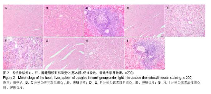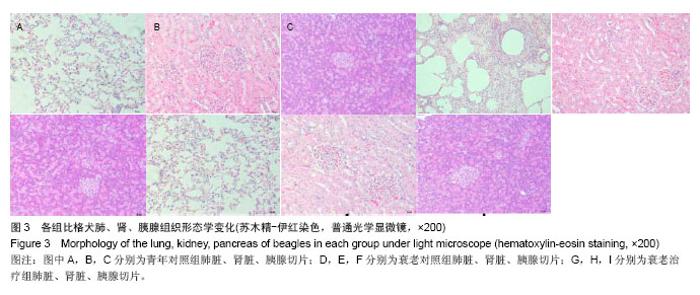 RESULTS AND CONCLUSION: (1) Before treatment, the levels of superoxide dismutase and glutathione peroxidase in the aging control and treatment groups were lower than those in the young control group (P < 0.05), while the malondialdehyde content was higher than that in the young control group (P < 0.05). However, there was no significant statistical difference between aging control and treatment groups (P > 0.05). (2) For the aging treatment group at 24 weeks of treatment: the beagle fur became clearer and smoother, motility was strengthened, appetite became better; and the activity of superoxide dismutase in serum at 8 to 24 weeks of treatment increased significantly compared with before treatment (P < 0.05), the activity of glutathione peroxidase significantly increased from 6 weeks (compared with treatment before, P < 0.05), the malondialdehyde content decreased significantly from 4 weeks of treatment to the completion of the experiment (compared with before treatment, P < 0.05). (3) After the experiment, the microscopic observation showed that compared with the aging control group, the tissues and organ structures of the aging treatment group were all clear, had no inflammatory infiltrates, no obvious necrosis and fibrosis lesions. These results were mainly consistent with the observations of young control group. The above results show that umbilical cord mesenchymal stem cells combined with lycopene therapy on the natural aging beagles may enhance the activities of antioxidant enzymes, reduce malondialdehyde content, and their combination also can repair tissue structures and promote the functions, which has obvious anti-aging effects.