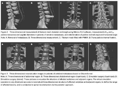 RESULTS AND CONCLUSION: Three-dimensionally reconstructed models were clearly visible in Dicom format, and can reproduce the structure of affected vertebrae and adjacent organs. The virtual stimulation operation provided clarity with strong relief perception. Virtual simulation surgery accurately visualize three-dimensional structure of malignant tumor and adjacent structure, position the lesion site, and reconstruct spinal sequence via the posterior approach. This method provides an objective evidence for individualized treatment programs.