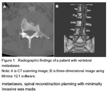 BACKGROUND: Vertebral metastatic tumor often damages vertebral body and the appendix, and causes severe pain in patients and high incidence of complications, such as paraplegia and spinal kyphosis. The principle of metastatic tumor treatment is early diagnosis, complete surgical resection, and postoperative chemotherapy. Imaging techniques such as CT can detect spinal metastases and accurately position the tumor before surgery. Currently visualized simulation and virtual reality techniques have been increasingly used in the field of orthopedics.