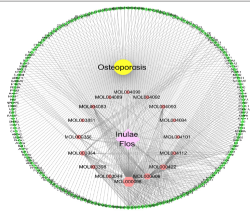 RESULTS AND CONCLUSION: There were 19 effective pharmaceutical active ingredients of Inulae flos and 180 potential targets for osteoporosis treatment, such as AKT1, TP53, VEGFA. Quercetin, luteolin, and kaempferol are considered to be the key effective ingredients for the treatment of osteoporosis by Inulae flos. The results of enrichment analysis showed that the therapeutic effect of Inulae flos on osteoporosis may be related to cell proliferation and apoptosis, aging, hormone levels and hypoxic stress and other life processes, and may be directly or indirectly associated with mediating signaling pathways such as FOXO, PI3K-Akt, and hypoxia inducible factor 1. The therapeutic effect of Inulae flos on osteoporosis needs to be verified by more basic experiments. Our research provides new ideas and new methods for follow-up experiments.